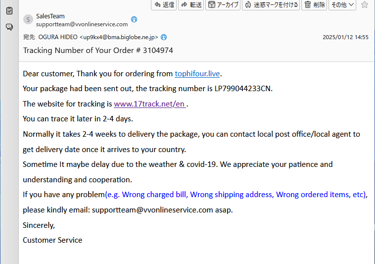 文中のtracking number LP799….を入れるとそれらしい回答が返ってくる。