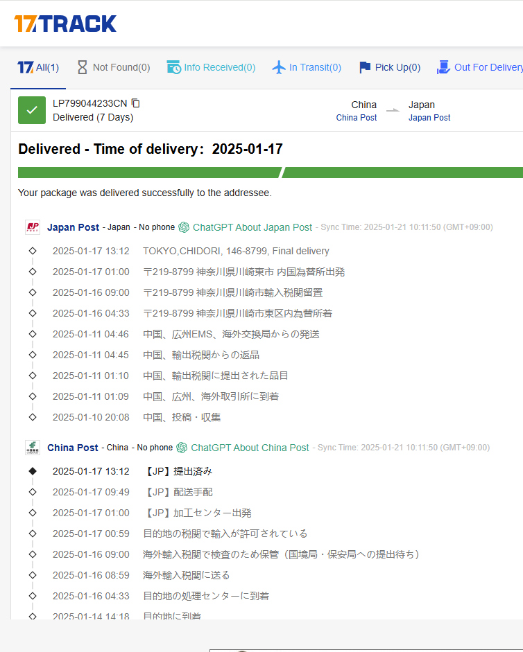 その後順調に(?)日本郵便に引き渡され とうとう1月17日に