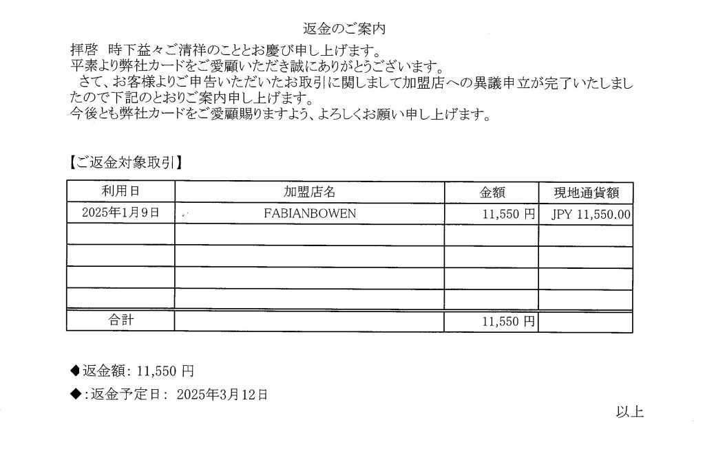 カード会社の担当の方から証拠書類を送って下さいと言われたので