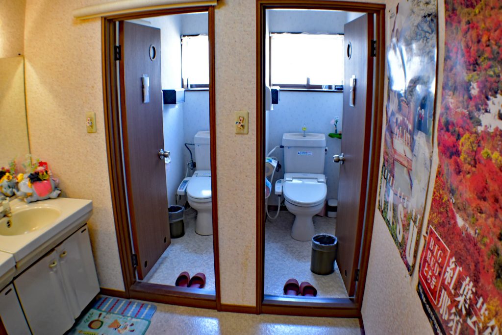 男女共用です。一階廊下(水のみ)と風呂更衣室にもあります。