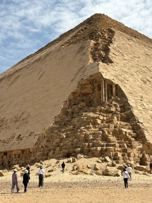 このピラミッドは急角度で岩を積んだため歪みがおおきくなり途中から角度を変えたと言われています。